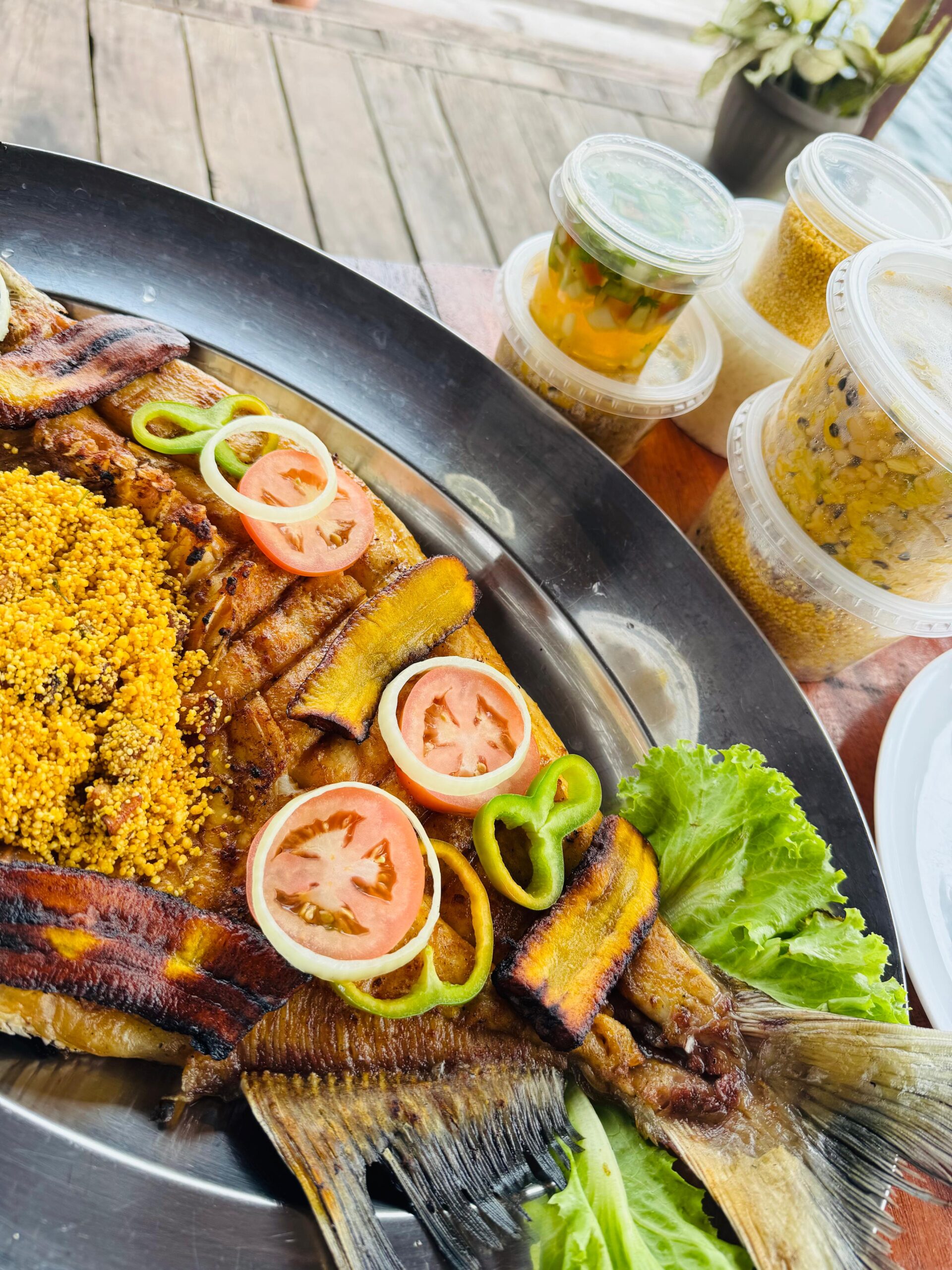 A farofa de banana-da-terra é um clássico amazonense, perfeita como acompanhamento para o peixe assado. Já o vinagrete com pimenta de cheiro e cheiro-verde é essencial para dar aquele toque especial à refeição.